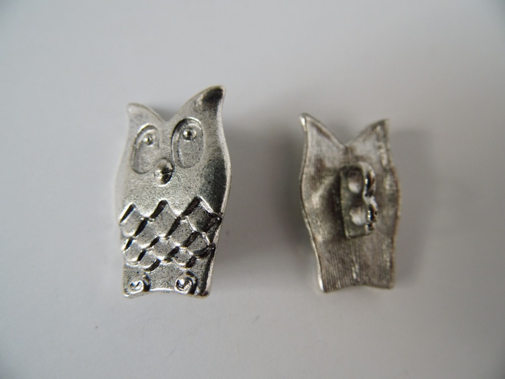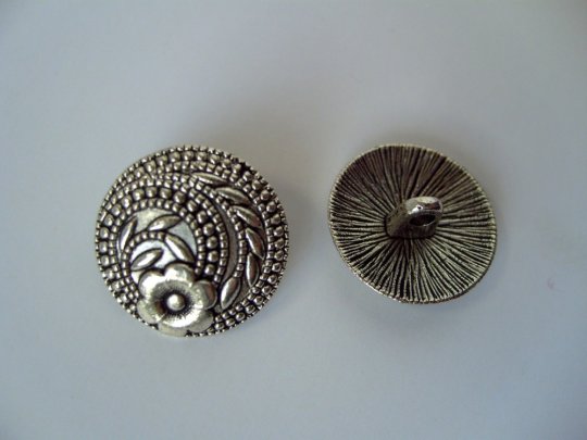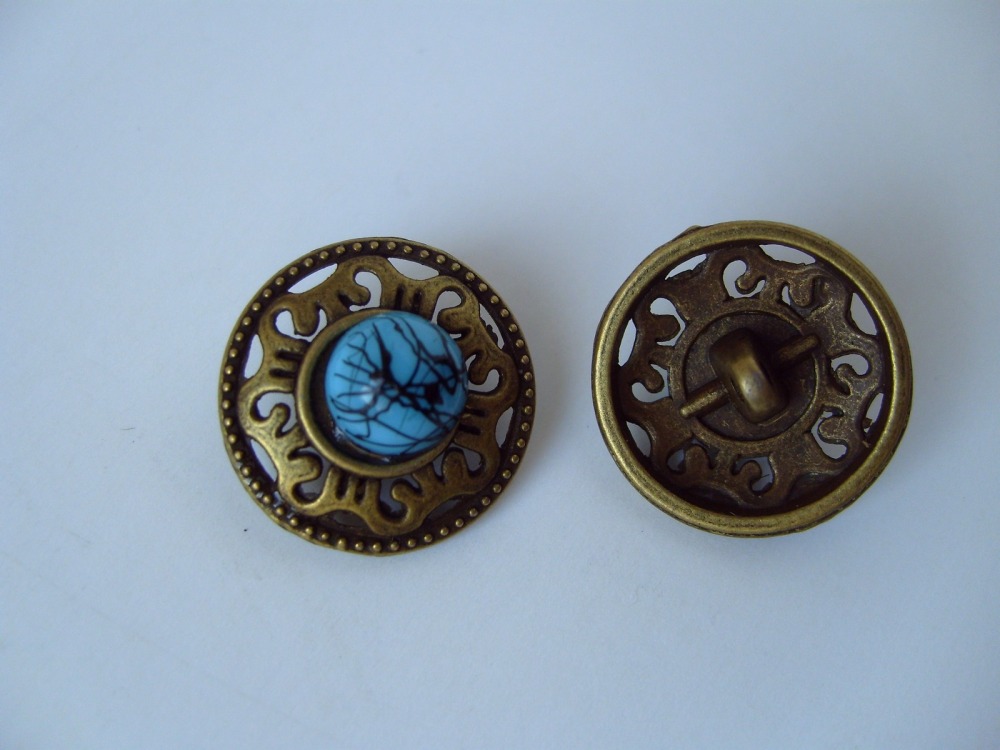 Messingfarvet metalknap med turkisfarvet/sort plastikperle i midten