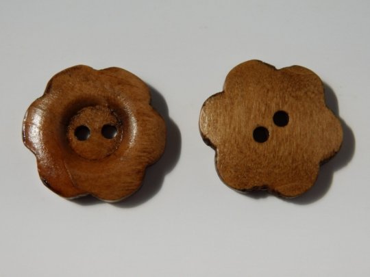 Mørkbrun knap formet som blomst fremstillet af kokosnøddeskal.